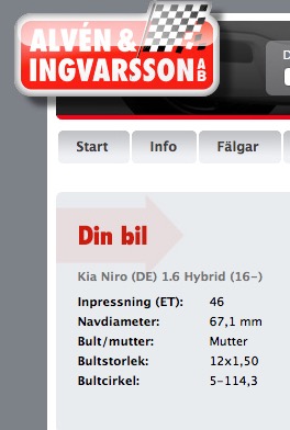 För egen del vet jag att mina original sommarhjul till min Niro har ET45 på 6,5Jx16 (står inpräntat på fälgarnas insida) och mina vinterhjul från min återförsäljare har följande data (enligt en uppgift på tillverkaren Alutecs hemsida: