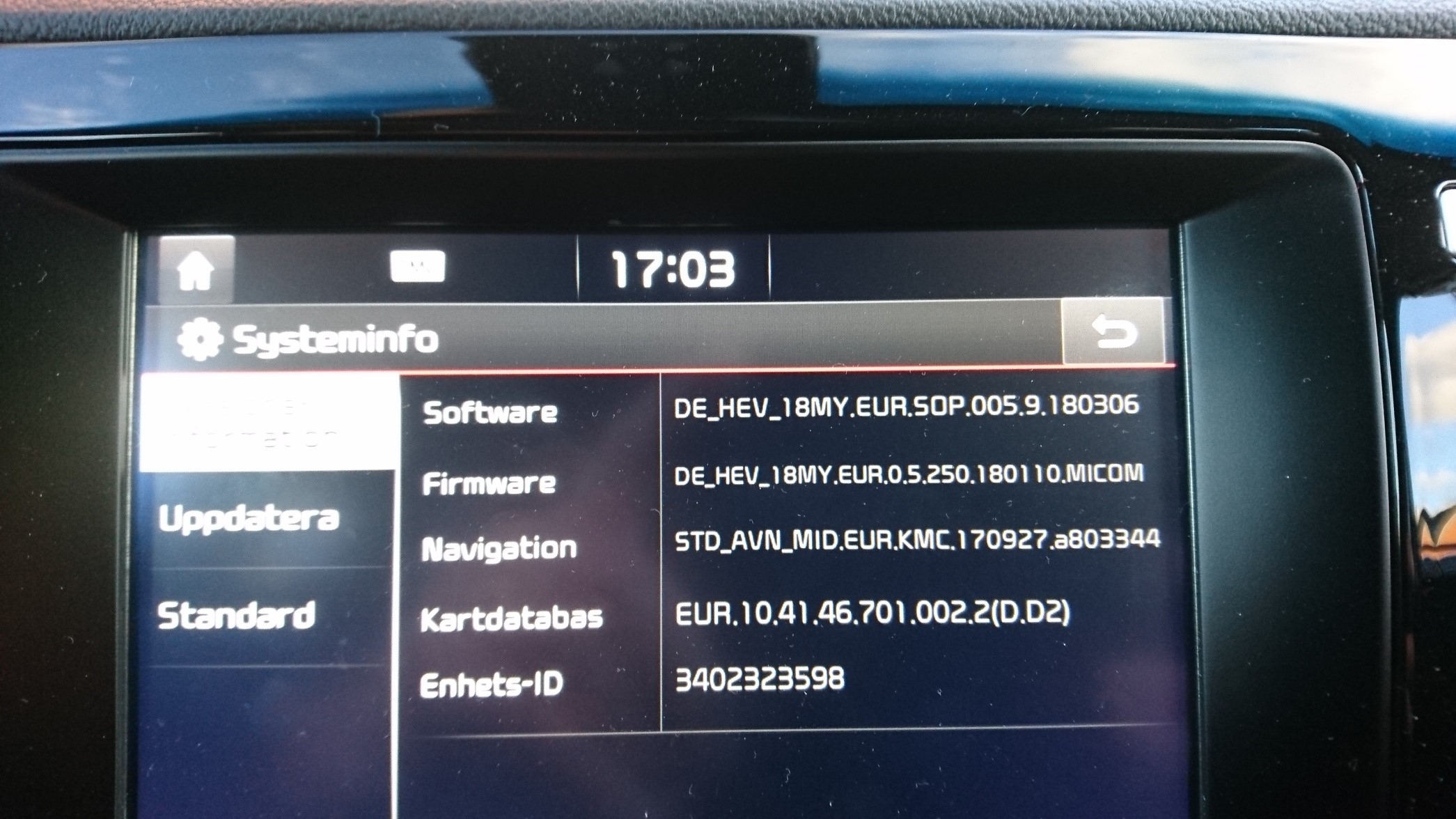 HellboyElvis skrev:Det var ett oförskämt svar du fick. Mjukvaran som du har är sedan bilen tillverkades och minst 2 uppdateringar har släppts sedan dess. Att verkstaden inte har packat upp mjukvaran än är isåfall ren lathet. Den senaste mjukvaran (se bilden) innehåller allvarliga buggfixar sen 1709-versionen. Alla auktoriserade KIA-verkstäder har/SKA ha den senaste mjukvaran tillgänglig.