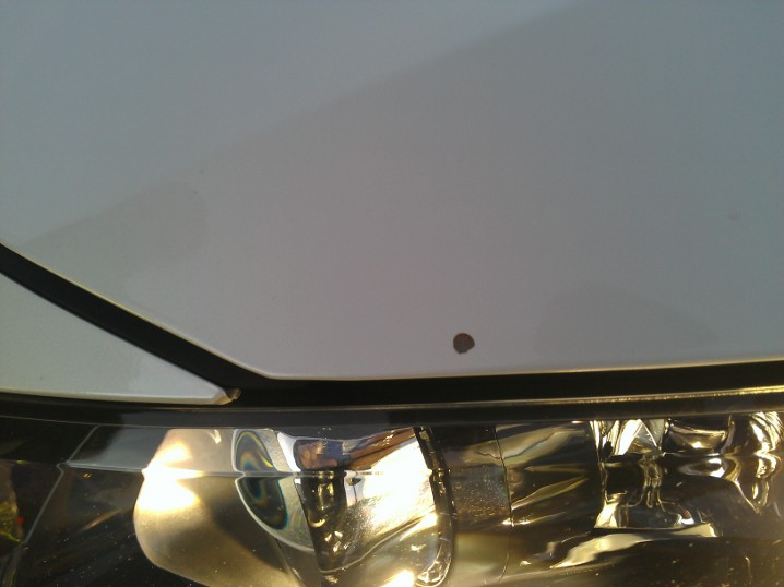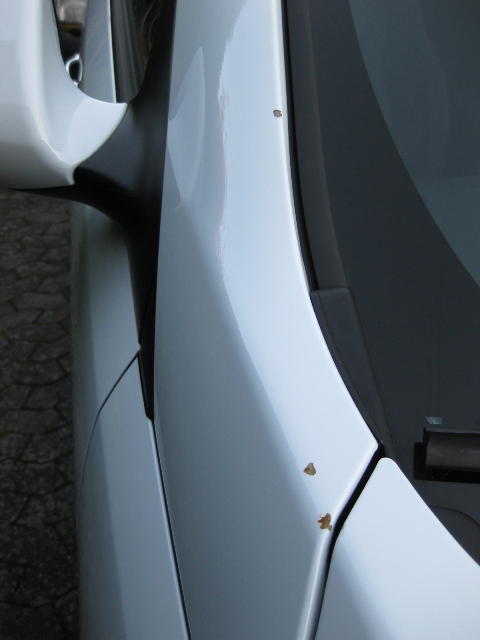 Lacken på Kia verkar vara så spröd att minsta lilla stenskott gör att färgen släpper totalt, och likaså grundfärgen.