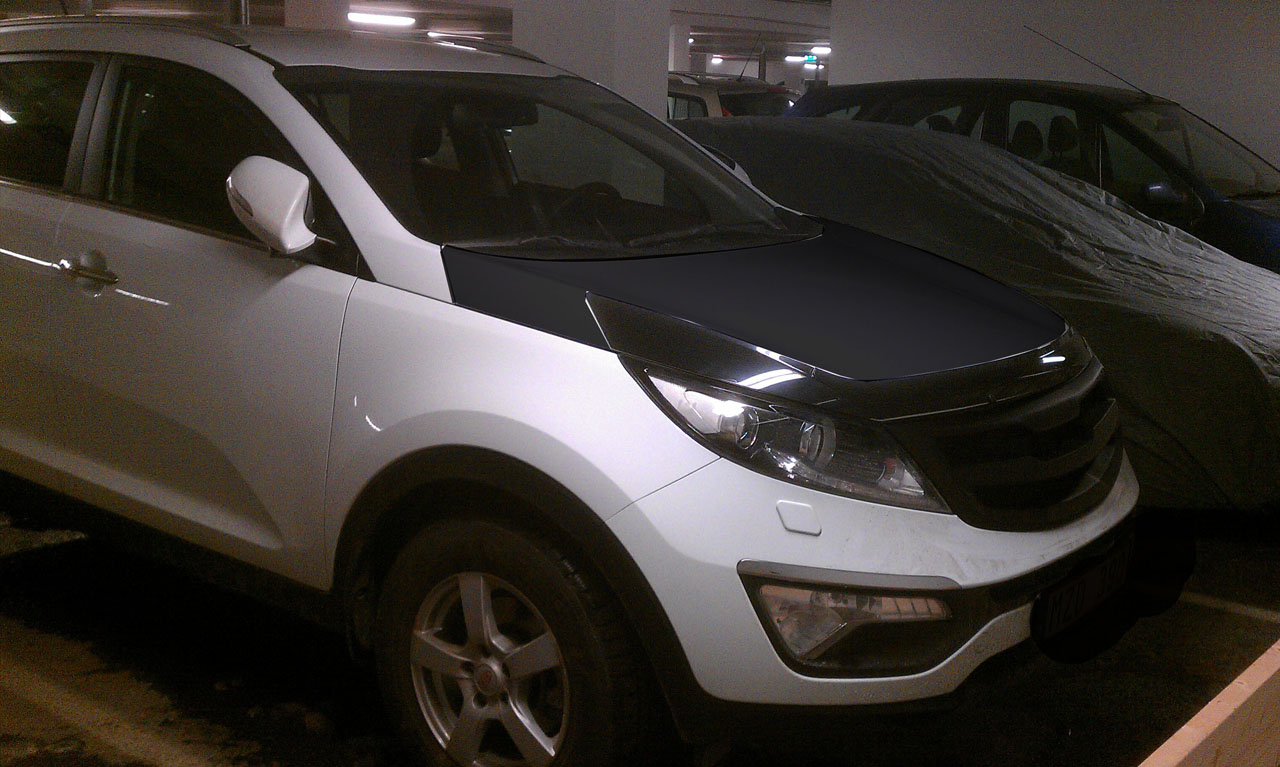 Lite snabba mobilfoton.. Gjorde ett snabbtest på hur det skulle kunna se ut med svart motorhuv. Blev lite sugen på det faktiskt.. BTW, ETT HELVETE att få loss grillen... jag orkade inte hålla på med fronten hit och dit, tog ett jävla tag att få bort alla skruvar... fick hitta på egna skruvmejslösningar