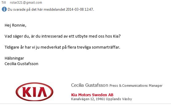 Kia Sverige har hört av sig och undrar om vi skulle ha någon träff i år och isf så är de intresserade av att vara delaktiga på något vis. Se nedanstående skärmklipp. Uppdaterar om nya uppgifter inkommer.